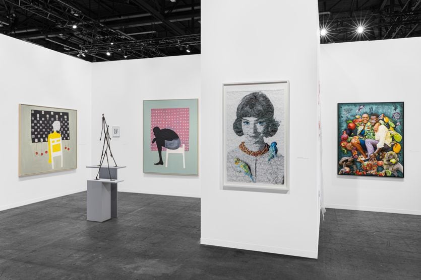 Entre las tendencias, se perfila el regreso de Neo-Geo, marcado por la presencia de John Armleder (1948) —expuesto tanto en el espacio temporal del MAMCO como en el Museo de Historia del Arte— y Sylvie Fleury (1961). Fuerte atención a la pintura y a las obras bidimensionales, con una importante presencia de artistas negros: la Galerie 38 (Marrakech) presenta un tapiz de Barthélémy Toguo (260.000 euros); gowen expone Romeo Mivekannin (Benín, 1986); Wilde trae Omar Bacuyos precios han aumentado de unos cientos de francos a 100.000 francos, ahora también en el establo Templon. La parisina MAGNIN-A registra importantes ventas: tres lienzos Nathalie Boutte incluidas dos grandes obras (“Gertrude Bell”, 2025; “La niña de los pájaros”, 2022) a 17.100 euros; Jp Mika vende dos cuadros, uno pequeño por 5.700 euros y “Estos años” (2024) por 40.000 euros.