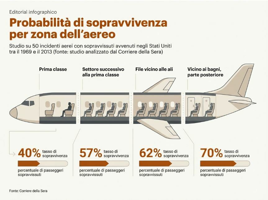 Según los números, cuanto más te muevas hacia la parte trasera del avión, más probabilidades tendrás de sobrevivir en caso de accidentes graves. La tasa de supervivencia aumenta del 40% para los de primera clase al 57% para los del sector superior. El porcentaje aumenta al 62% para los pasajeros de las filas cercanas a las alas, hasta el 70% para los que están sentados cerca de los baños. Datos que también parecen confirmar lo ocurrido en Kazajstán: todos los fallecidos, incluidos los pilotos y una azafata, se encontraban en la zona delantera del avión en el momento del impacto.