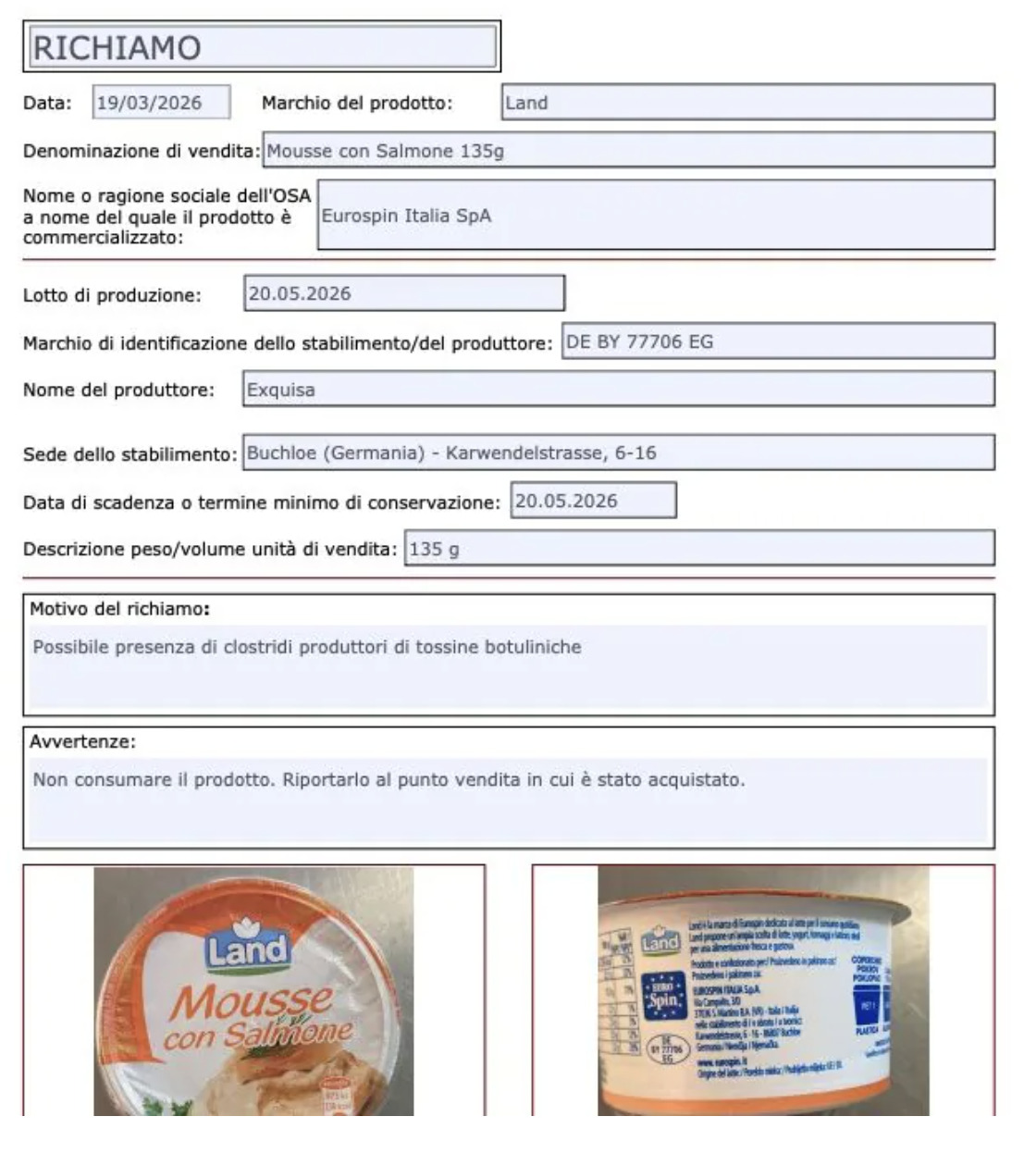 la cadena de supermercados Eurogiro ordenó el retiro inmediato de un mucha mousse de salmón para un posible riesgo microbiológico. La medición está ligada a la sospecha de la presencia de toxinas botulínicaspotencialmente peligroso para la salud de los consumidores. El producto afectado es la mousse de salmón de la marca Land, que se vende exclusivamente en las tiendas Eurospin.