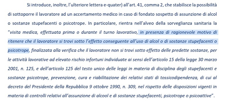 He aquí el texto de la circular que abre la vía a los controles sorpresa incluso en horario laboral. “Además, se introduce en la técnica la letra adicional e-quater). 41, párrafo 2, que prevé la posibilidad de someter al trabajador a un reconocimiento médico en caso de sospecha fundada de consumo de alcohol o sustancias estupefacientes o psicotrópicas. En particular, “el examen médico, realizado antes o durante la jornada de trabajo, en presencia de motivos razonables para creer que el trabajador se encuentra bajo la influencia del alcohol o de sustancias estupefacientes o psicotrópicas, destinado a verificar que el trabajador no se encuentra bajo la influencia de estas sustancias, para actividades laborales con alto riesgo de accidentes identificados de conformidad con el artículo 15 de la ley de 30 de marzo de 2001, n° 125, y el artículo 125 del Reglamento único del trabajo Ley sobre estupefacientes y sustancias psicotrópicas, prevención, tratamiento y rehabilitación de los estados relacionados con la drogadicción, a que se refiere el decreto del Presidente de la República de 9 de octubre de 1990, n. 309, de conformidad con las disposiciones vigentes en materia de controles relacionados con el consumo de alcohol y sustancias estupefacientes, psicotrópicas o psicoactivas.“.